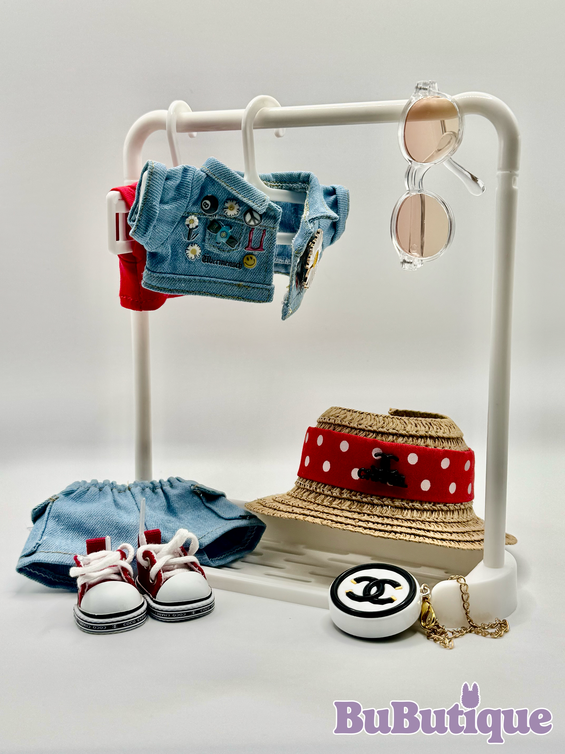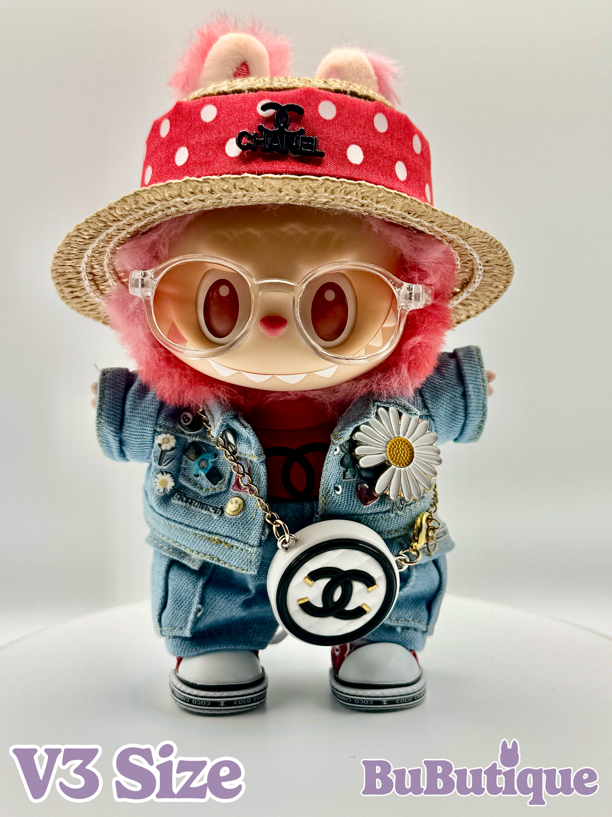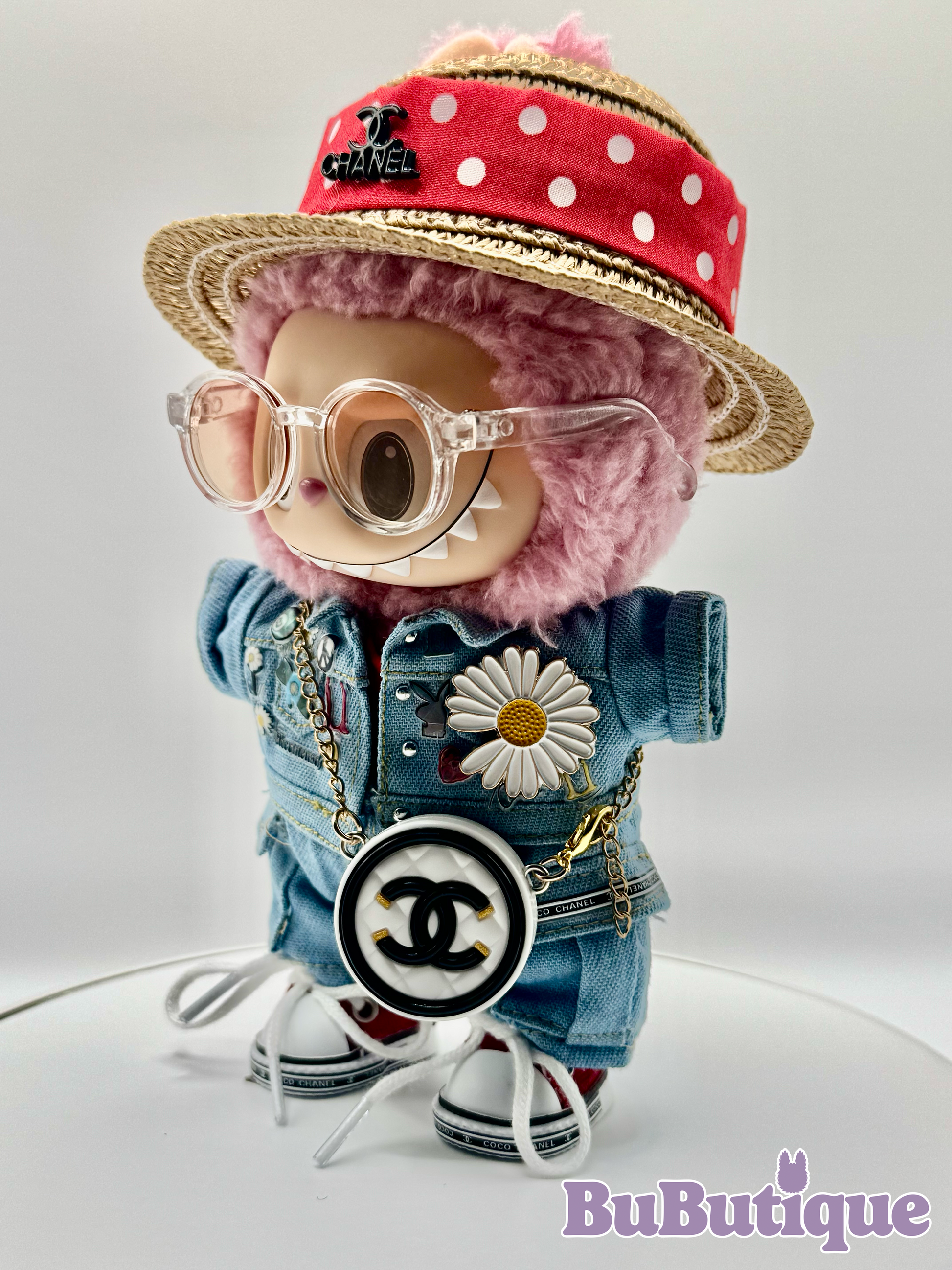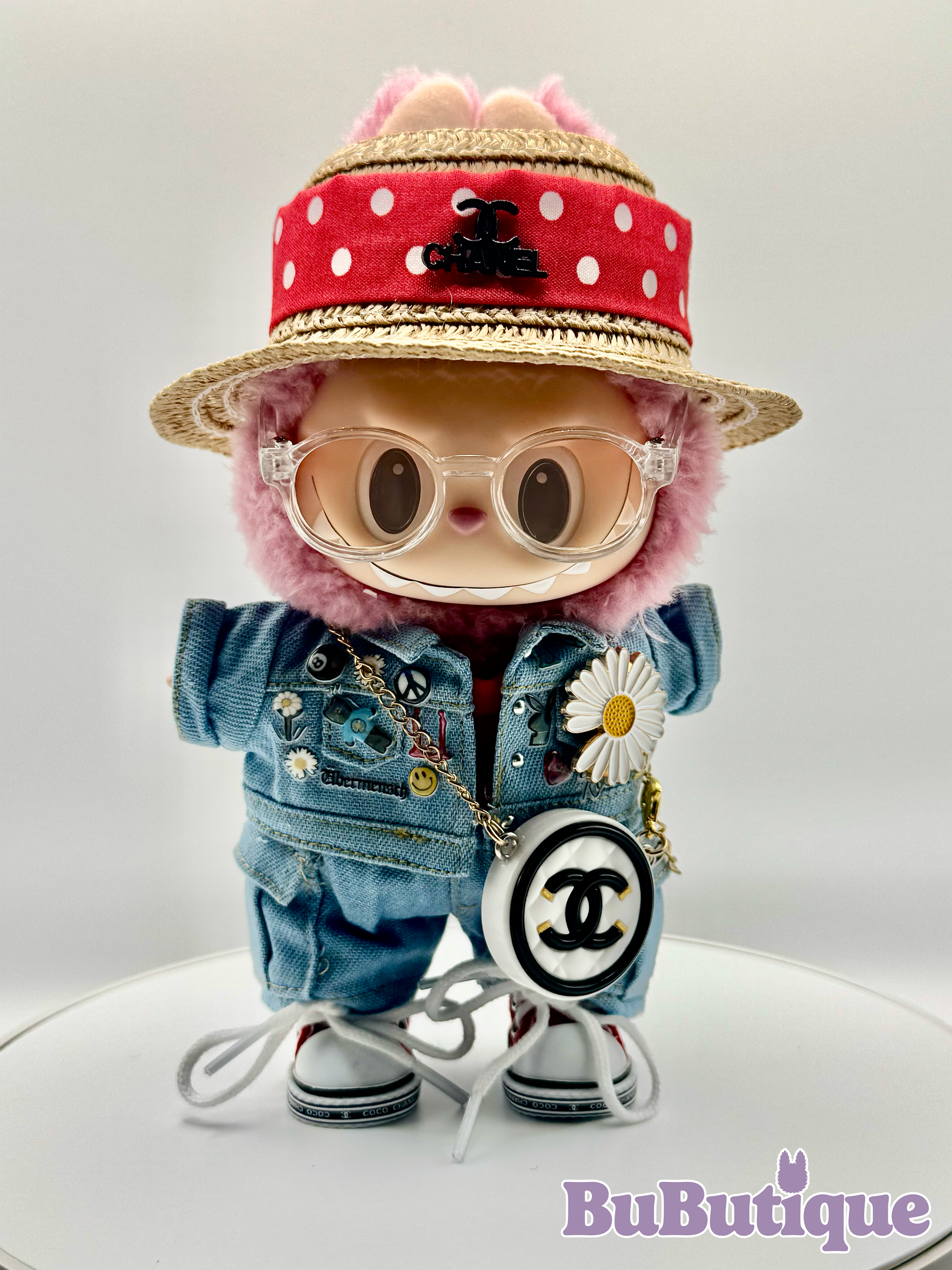 Bright, bold, and unapologetically stylish—Poppy is a six-piece statement outfit that blends playful energy with couture craftsmanship. This ensemble features a bespoke coco straw hat for effortless summer charm, paired with a floral patchwork denim jacket adorned with custom badges and pins for a unique, collectible edge. Matching denim trousers keep the vibe cohesive, while tinted transparent sunglasses add a retro-cool finish. A crisp white custom shoulder bag brings chic functionality, and striking red sneakers tie it all together with a pop of attitude. With Poppy, your Labubu is ready to own the spotlight in vibrant, curated style.