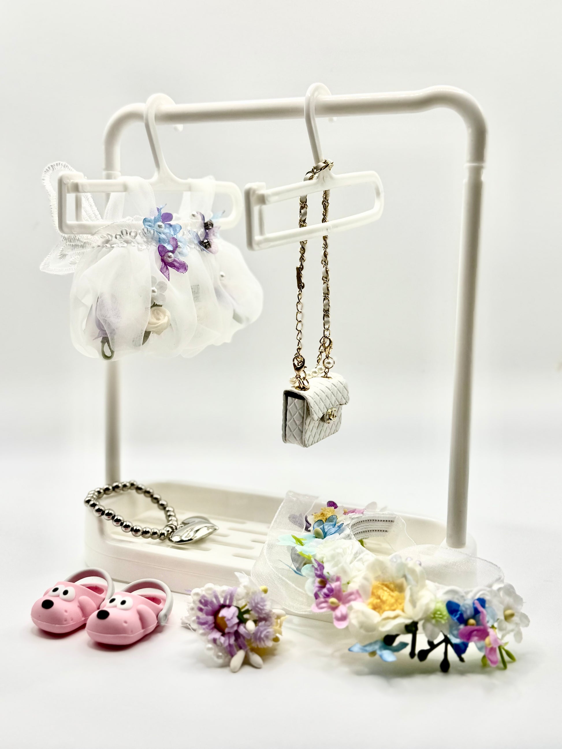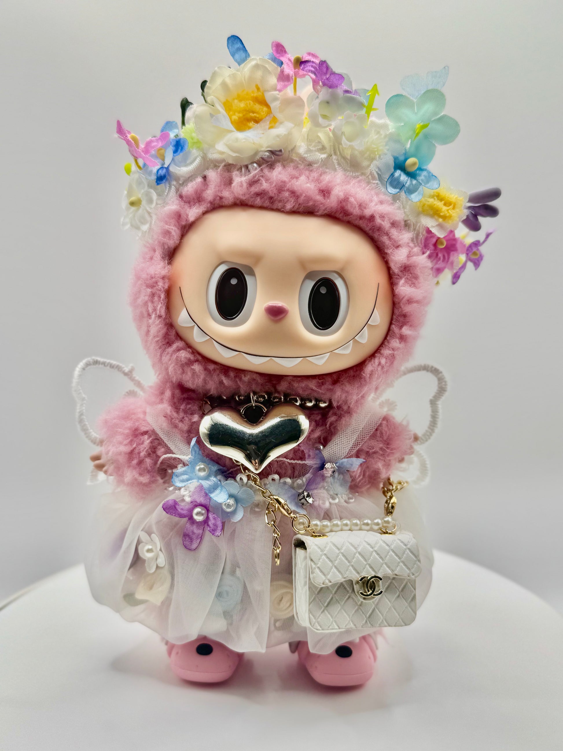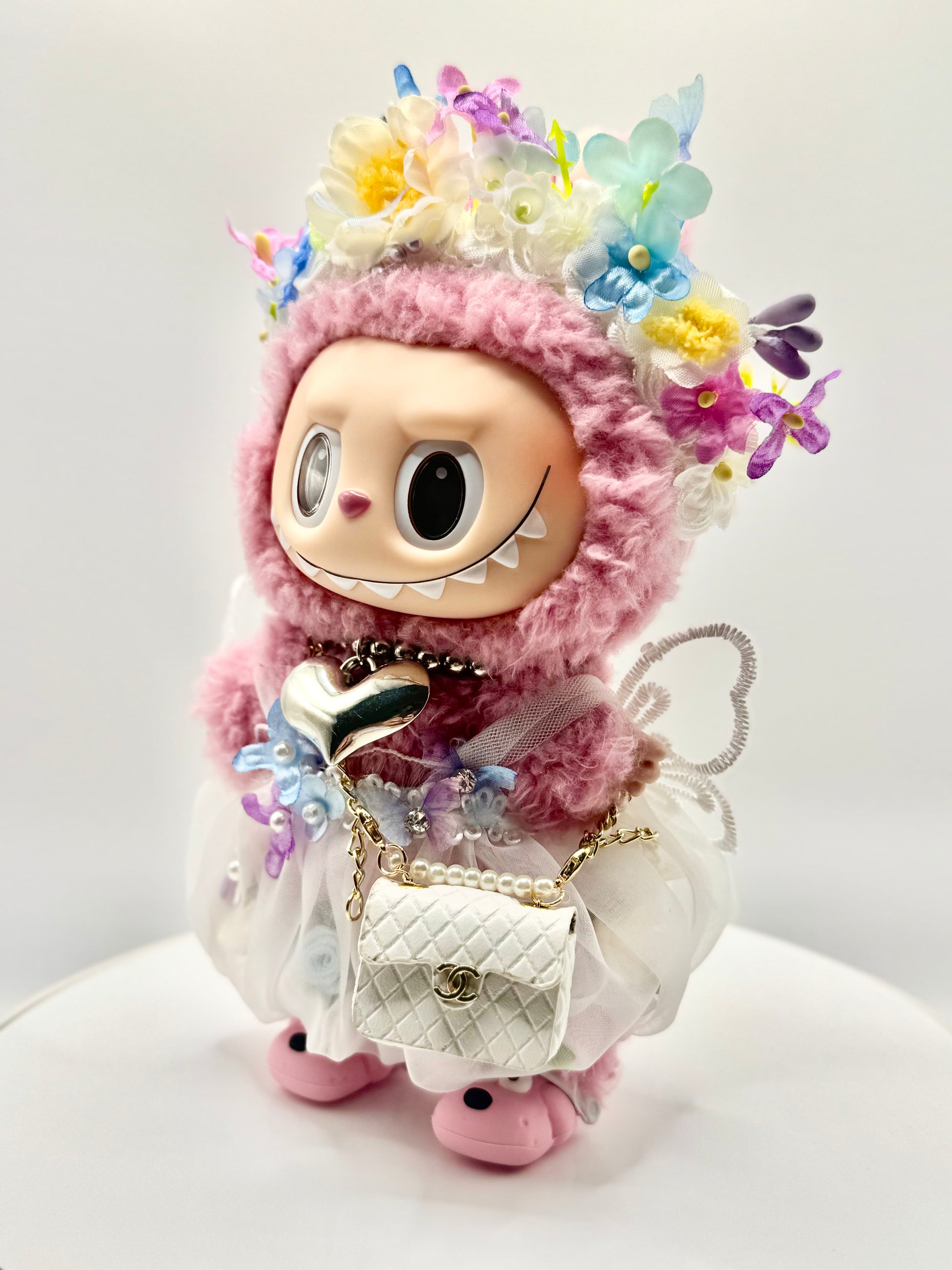 Elevate your Labubu’s style with Iris, a seven-piece couture-inspired outfit that blends bold elegance with casual chic. This set includes statement sunglasses, classic denim shorts, a sleek black shoulder purse, a luxurious silk head scarf, a vibrant red sweater, crisp white pleather shoes, and a stylish cap to complete the look. Perfect for collectors who love detail, Iris transforms your Labubu into a true fashion icon ready for any runway moment.