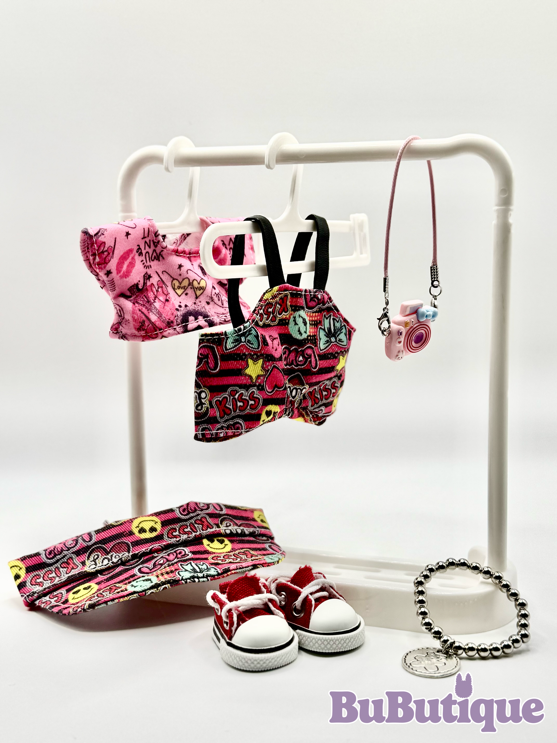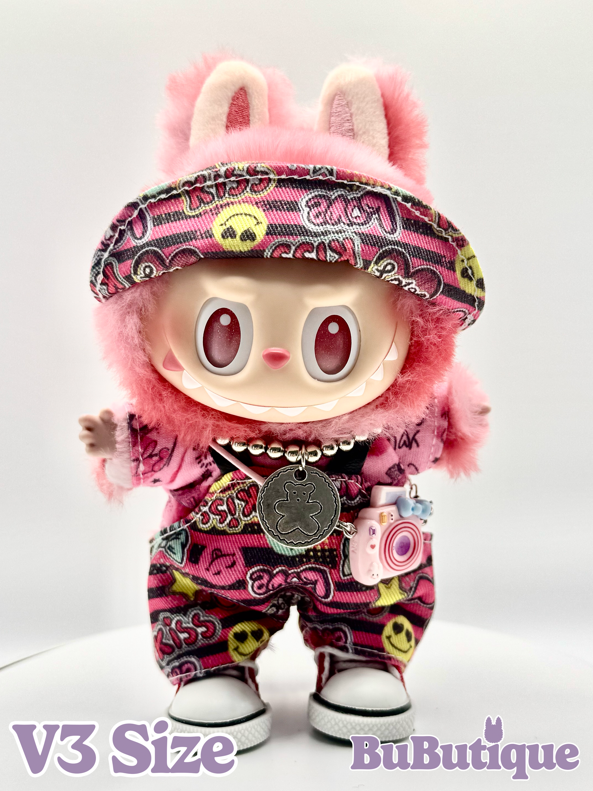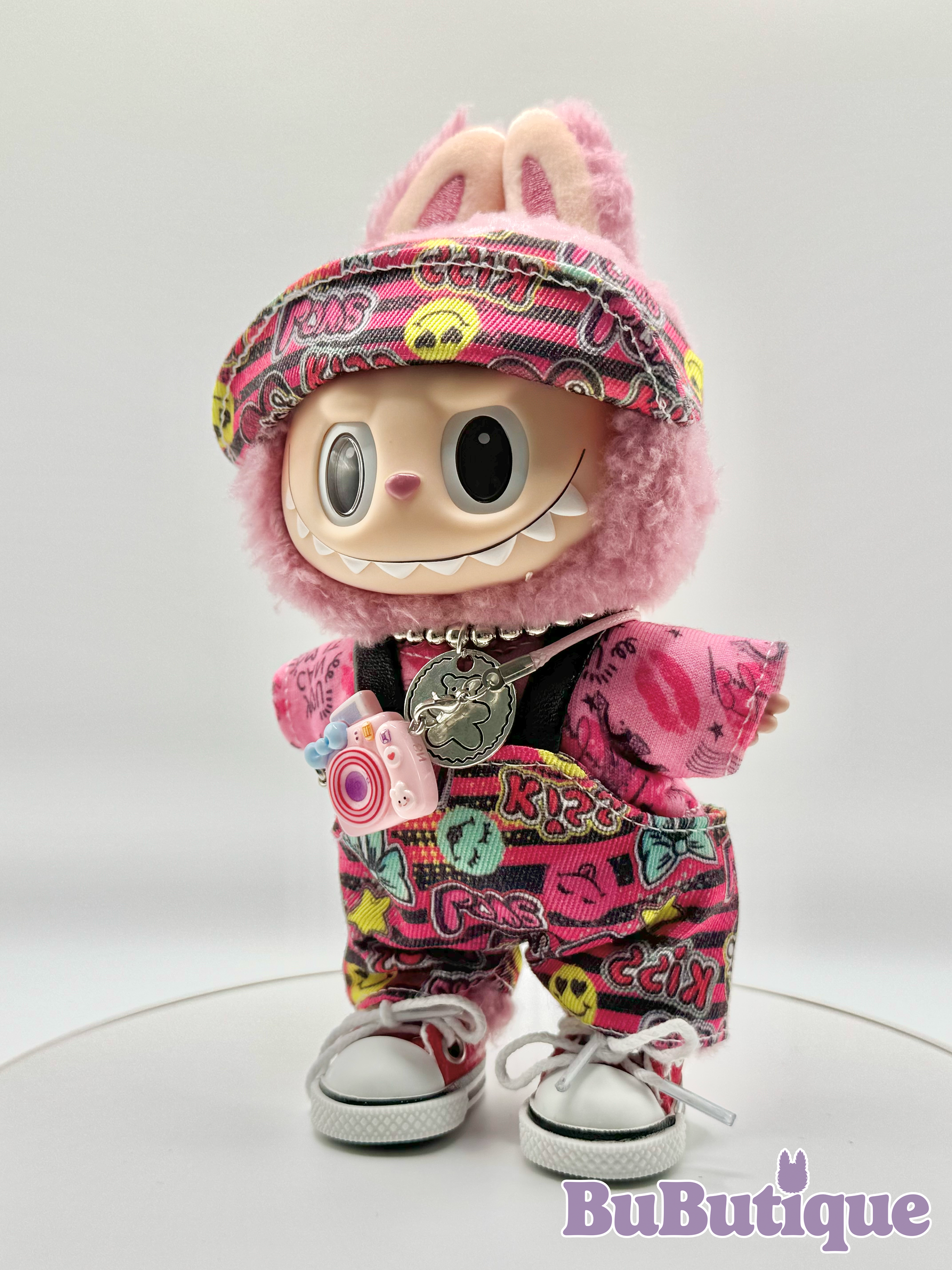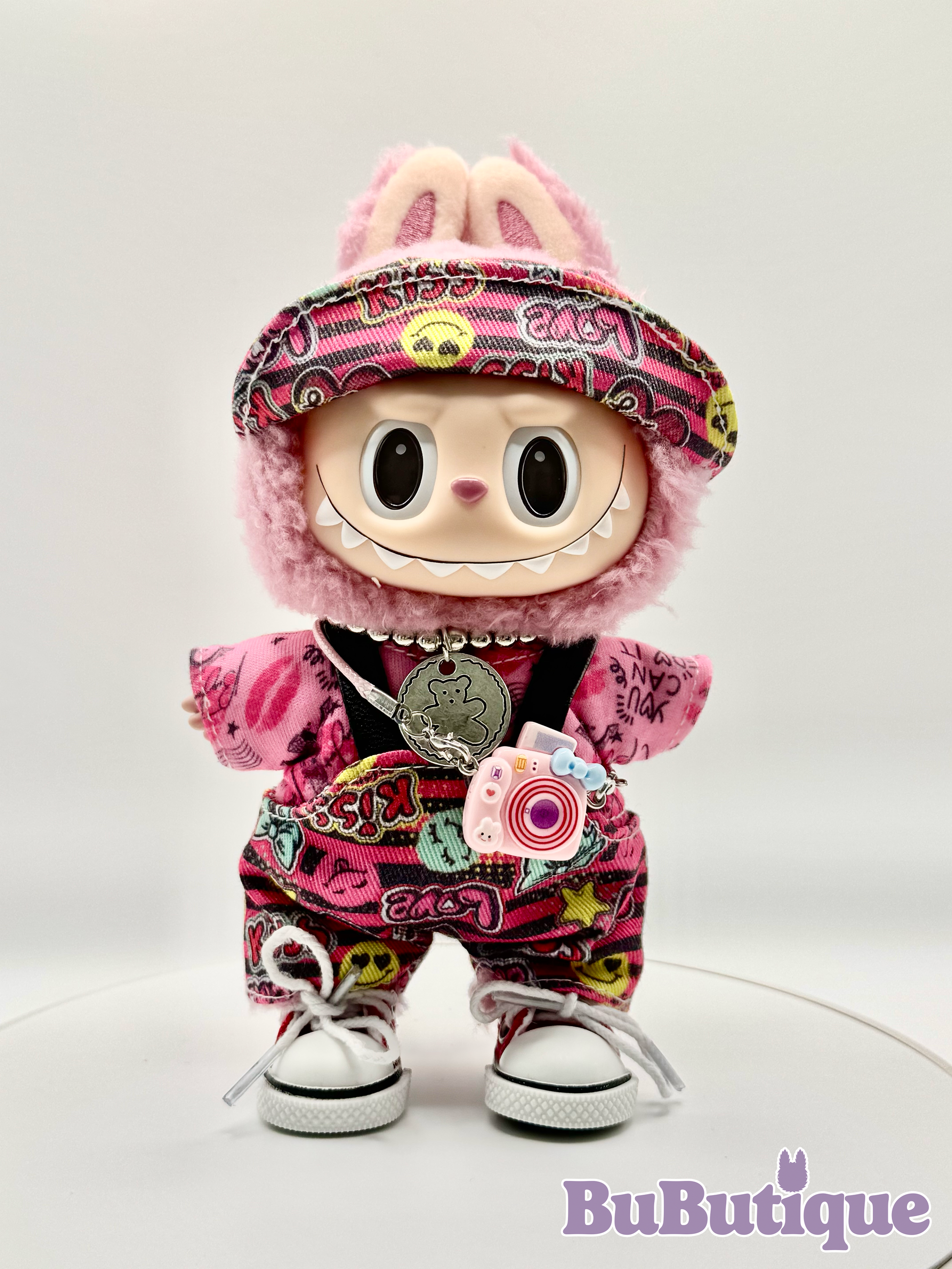 Playful meets polished with Peony, a six-piece look that celebrates bold color and joyful detail. This vibrant ensemble features a matching pink sun visor and dungarees combo for a coordinated statement, paired with a patterned pink T-shirt that ties the look together. A silver teddy bear chain adds a whimsical, luxe touch, while the miniature pink camera brings collector-worthy charm. Finished with bold red sneakers for a splash of contrast, Peony is your Labubu’s ultimate go-to for chic, carefree style with couture-level attitude.